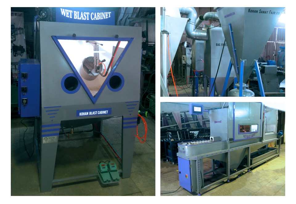 در این دستگاه ساینده درون مخزن آب که مقدار آن بستگی به حجم مخزن دارد ریخته می شود . سپس مخلوط آب و ساینده توسط هوای فشرده از نازل خارج شده و به سطح قطعه برخورد کرده و باعث تمیزی یا ماتی آن میشود. در دستگاه وت بلاست کابینتی نیاز به فیلتراسون نیست .
